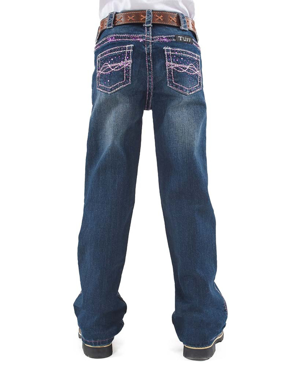 These Cowgirl Tuff medium wash blue denim jeans feature a combination of pink and white stitching, distressed areas, whiskering, and a distinctive pocket adorned with pink sequins and signature barbed wire.